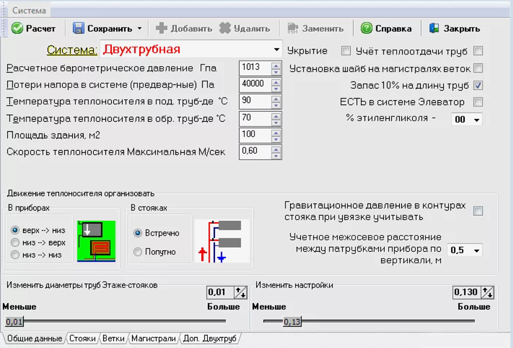 Тёпло/холод передаётся в помещения местными нагревательными приборами, калориферами, фэнкойлами, с организованным и не организованным учётом тепла в системе. Сложные по конфигурации системы (однотрубные, бифилярные и двухтрубные стояки и пр.) можно разделять на отдельные расчётные блоки с последующим автоматическим объединением с целью гидравлической увязки и получения общей спецификации оборудования в формате MS Word и AutoCAD